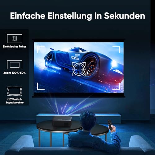 🎬VERBESSERTE BEDIENUNG🎬:Dank des elektrischen Fokus und der Trapezkorrektur können Sie Ihre Projektion für ein perfektes Seherlebnis ganz einfach fein abstimmen. Mit der intelligenten Fernbedienung des WLAN-Projektors können Sie mühelos klare Videos und Bilder von Ihrem Sofa oder Bett steuern. Die digitale Zoomfunktion bietet zusätzliche Flexibilität bei der Anpassung des Bildschirms, wodurch die Projektionsgröße perfekt an die Raumaufteilung angepasst wird.