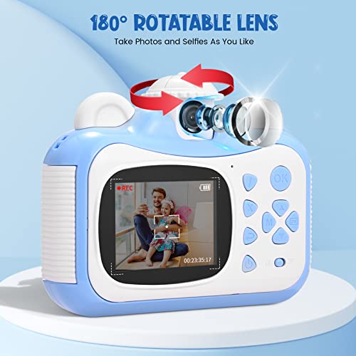 【12MP Digitalkamera mit zwei Linsen für Kinder】: Der Sofortbildkamera Kinder ist mit 12MP-Dual-Objektiv vorne und hinten ausgestattet, 1080P HD Video Auflösung. Es unterstützt auch Zeitrafferfotografie (2 s, 5 s, 10 s), Loop-Video und Audioaufzeichnung. Einem 2,4-Zoll IPS Augenschutzbildschirm ausgestattet, der die Sicht Ihres Kindes nicht beeinträchtigt. Es kann den klaren, wunderbaren Moment für Kinder aufzeichnen.