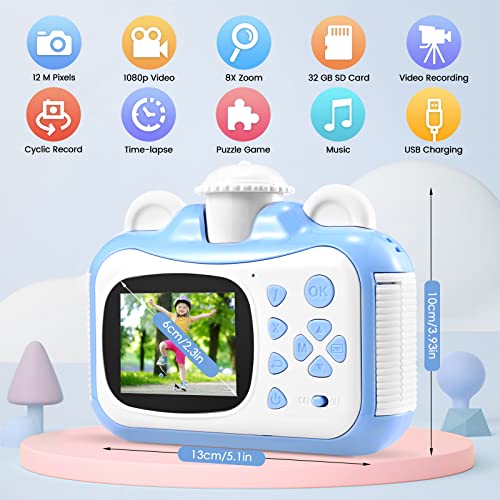 【Multifunktional und Benutzerfreundlich】: Die Digitalkamera Kinder ist vollgepackt mit Selfie, Videoaufnahme, Timer, Zeitraffer, automatischem Bildschirmschoner, etc. Verfügt die Kamera außerdem über 4 verschiedene Farbfilter, 39 verschiedene Cartoon-Fotorahmen und -figuren usw. Es hat 3 Rollen Druckpapier. Jede Rolle kann ungefähr 100 Fotos drucken. Und es kann viele Fotos mit einer 32-GB-SD-Karte speichern.
