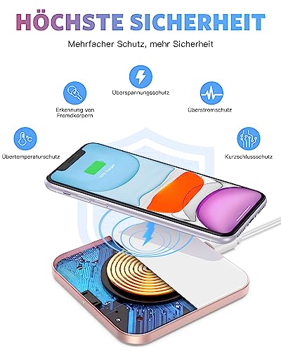 【HÜLLEFREUNDLICH & SICHER】Unser Wireless Schnellladegerät unterstützt Handyhüllen mit einer Dicke ≤8 mm, damit brauchen Sie die Handyhülle nicht mehr wiederholt abzunehmen. Stelle aber sicher, dass es keine Magnete, Metalle, Kreditkarten und andere Fremdkörper an der Handyhülle gibt. QI- und UL-Zertifizierung mit multifunktionaler intelligenter Schutztechnologie bietet Temperaturregelung, Überspannungs- und Überstromschutz, Kurzschlussverhütung und Fremdkörpererkennung.